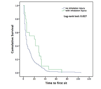 The day on which active mobilization and rehabilitation were first achieved differed between groups. Patients without inhalation injury experienced a shorter time to sit 5 (9-13) vs. 20 (13-28) days (p = 0.006) (Figure 1) and stand 9 (13-20) vs. 24 (14-33) days (p = 0.049) than those with inhalation injury. Additionally, there was a trend toward a shorter time to walk in patients without inhalation injury 12 (16-23) vs. 27 (16-35) days (p = 0.051).