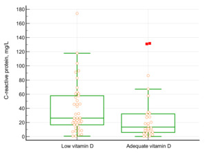 The mean age differs significantly between the group with low vitamin D level (66.48 ± 11.87) and the group with adequate vitamin D level (52.12 ± 14.26,p< 0.0001), but it could be explained by a negative association between vitamin D level and age (Pearson correlation, log-transformed data: r= -0.3770 p=0.0013). The level of CRP differs in the group with 25(OH)D <30 ng/ml [median 26.14, Q1, Q3: 16.61; 57.79] and in the group with 25(OH)D levels ≥30 ng/ml [median 13.43, Q1, Q3: 8.84; 27.58], p= 0.044. Figure 2 shows the difference in inflammatory marker CRP between patients with 25(OH)D levels <30 ng/ml and those with 25(OH)D levels ≥30 ng/ml.