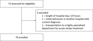 We included 70 participants for data analysis (three were excluded due to length of hospital stay <24 hours, initial admission in another hospital with current diagnosis and transportation to high specialized department for acute stroke treatment). The median age was 62 years [Q1, Q3: 58; 66.67], with 57.14% female patients. The median follow-up time was eight (5-12) days; six patients (8.57%) died during the study period. Table 1 summarizes participants’ main demographic and clinical characteristics according to serum vitamin D status.